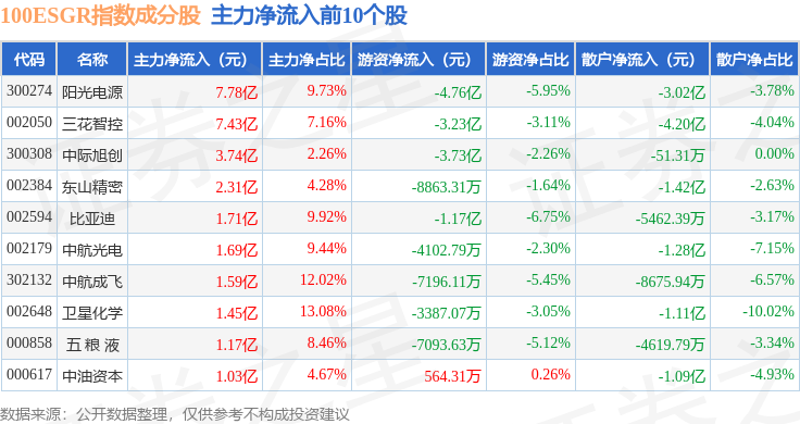 资金流向方面,100ESGR(470027)指数成份股当日主力资金净流出合计31.33亿元,游资资金净流出合计3.36亿元,散户资金净流入合计34.69亿元。成份股资金流向详情见下表: