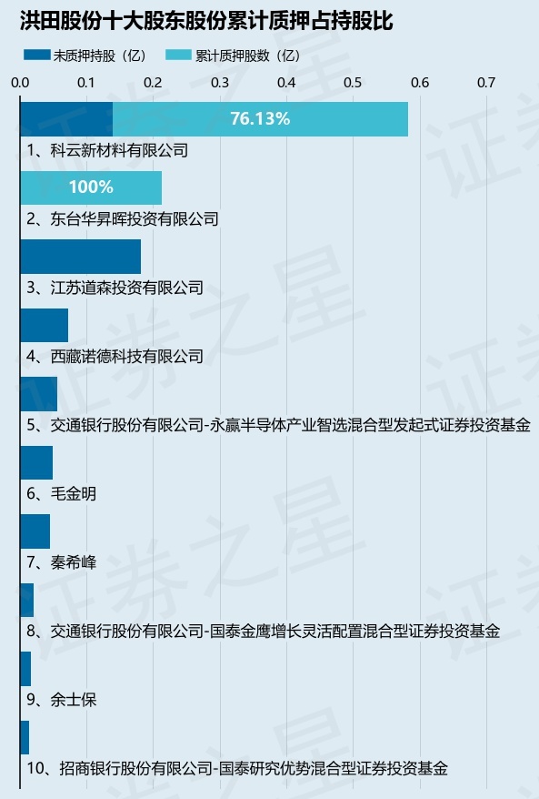 截止本公告日,股东科云新材料有限公司已累计质押股份4433.53万股,占其持股总数的76.13%,股东东台华昇晖投资有限公司已累计质押股份2132.0万股,占其持股总数的100.0%。本次质押后洪田股份十大股东的累计质押股份占持股比例(占持股比例的计算以公司最新一期财务报表公布的十大股东的持股总数为基准)见下图: