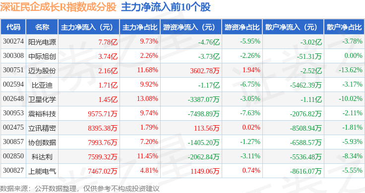 资金流向方面,深证民企成长R(470071)指数成份股当日主力资金净流出合计7.82亿元,游资资金净流出合计5425.85万元,散户资金净流入合计8.36亿元。成份股资金流向详情见下表: