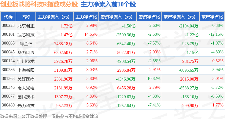 资金流向方面,创业板战略科技R(471004)指数成份股当日主力资金净流出合计7.9亿元,游资资金净流出合计9880.84万元,散户资金净流入合计8.89亿元。成份股资金流向详情见下表:
