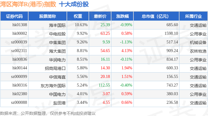 湾区海洋R(港币)(480020)指数十大成份股详情如下: