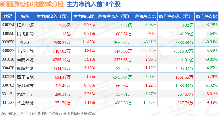 资金流向方面,新能源电池R(480027)指数成份股当日主力资金净流出合计13.49亿元,游资资金净流出合计2.01亿元,散户资金净流入合计15.5亿元。成份股资金流向详情见下表: