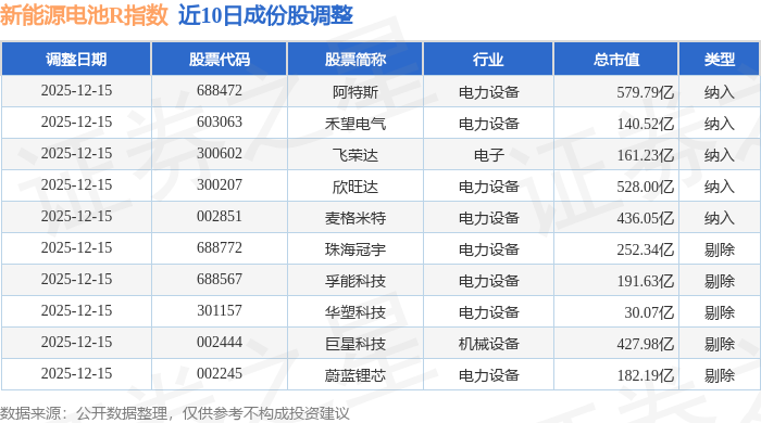 近10日内新能源电池R(480027)指数成份股做了调整,新纳入了5只股票,剔除了5只股票。