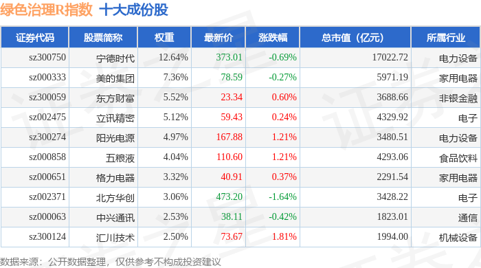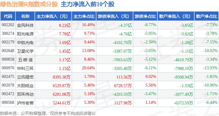 资金流向方面,绿色治理R(480058)指数成份股当日主力资金净流出合计10.37亿元,游资资金净流出合计5.87亿元,散户资金净流入合计16.24亿元。成份股资金流向详情见下表: