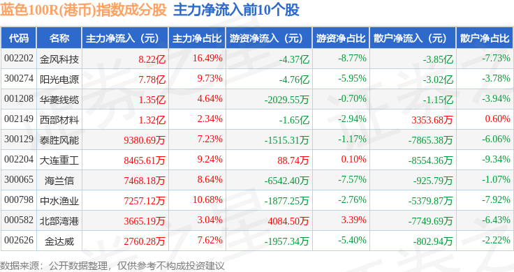 资金流向方面,蓝色100R(港币)(480069)指数成份股当日主力资金净流入合计11.3亿元,游资资金净流出合计11.27亿元,散户资金净流出合计297.01万元。成份股资金流向详情见下表:
