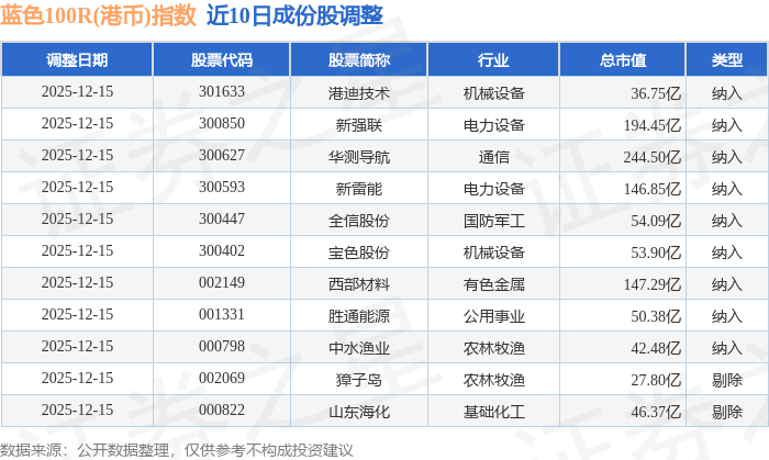 近10日内蓝色100R(港币)(480069)指数成份股做了调整,新纳入了9只股票,剔除了2只股票。