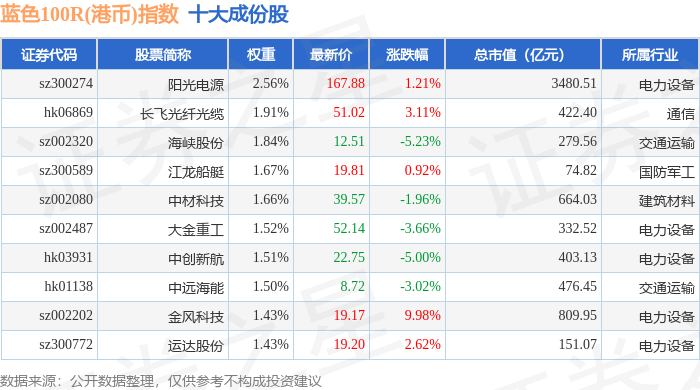 蓝色100R(港币)(480069)指数十大成份股详情如下: