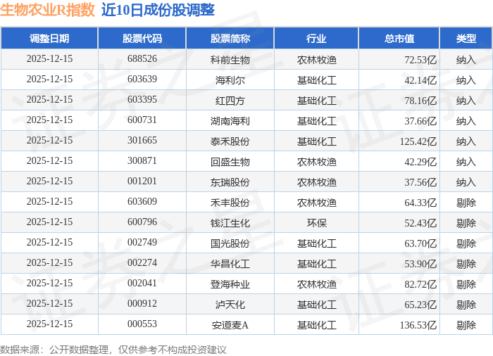 生物农业R(480072)指数十大成份股详情如下: