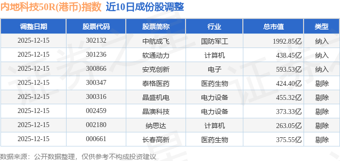 近10日内内地科技50R(港币)(483004)指数成份股做了调整,新纳入了3只股票,剔除了5只股票。