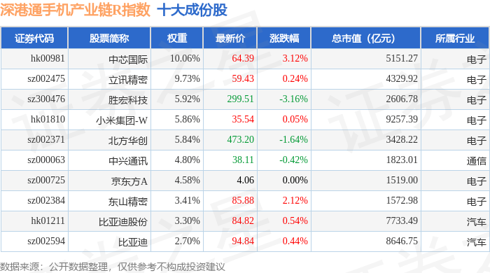 深港通手机产业链R(483009)指数十大成份股详情如下: