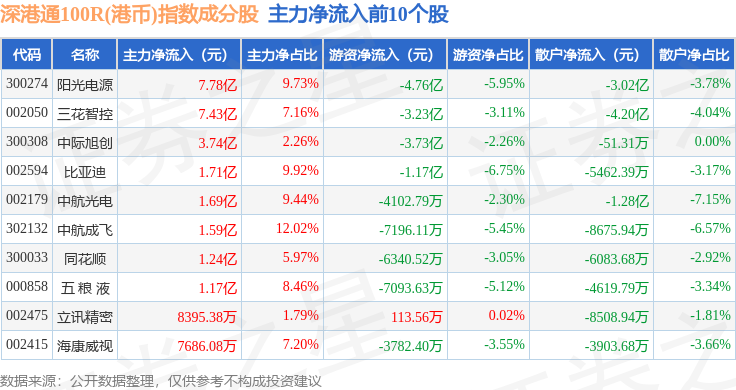 资金流向方面,深港通100R(港币)(483008)指数成份股当日主力资金净流出合计15.69亿元,游资资金净流出合计1.22亿元,散户资金净流入合计16.91亿元。成份股资金流向详情见下表: