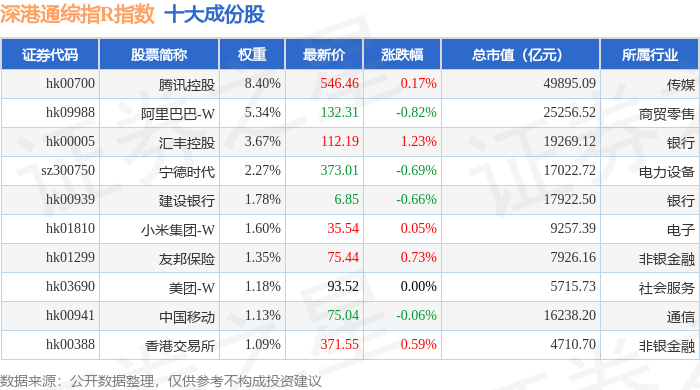 深港通综指R(483005)指数十大成份股详情如下: