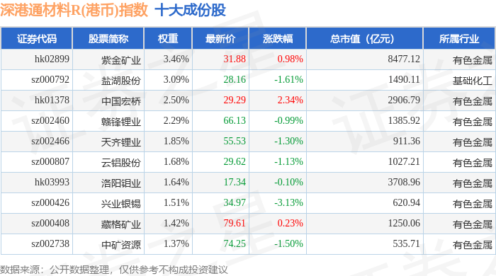 深港通材料R(港币)(483016)指数十大成份股详情如下: