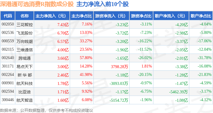 资金流向方面,深港通可选消费R(483019)指数成份股当日主力资金净流入合计17.38亿元,游资资金净流出合计18.68亿元,散户资金净流入合计1.3亿元。成份股资金流向详情见下表: