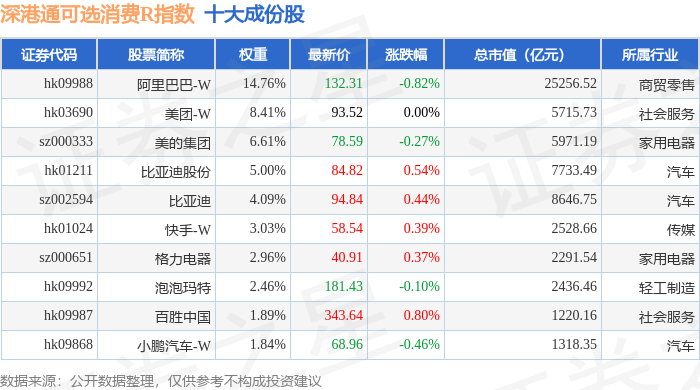 深港通可选消费R(483019)指数十大成份股详情如下: