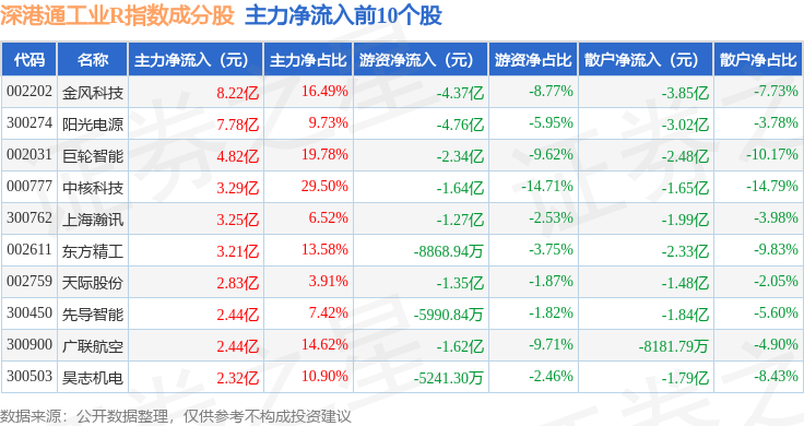 资金流向方面,深港通工业R(483017)指数成份股当日主力资金净流出合计3.82亿元,游资资金净流出合计25.14亿元,散户资金净流入合计28.96亿元。成份股资金流向详情见下表: