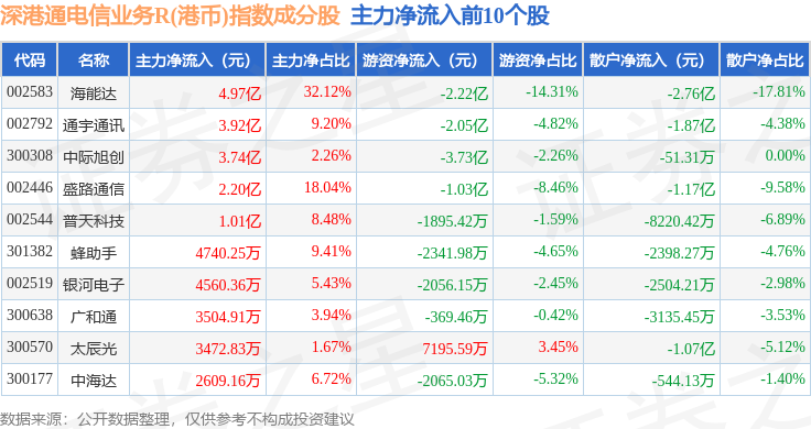 资金流向方面,深港通电信业务R(港币)(483030)指数成份股当日主力资金净流出合计21.36亿元,游资资金净流入合计8.06亿元,散户资金净流入合计13.31亿元。成份股资金流向详情见下表: