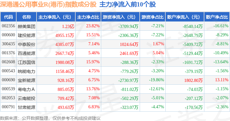 资金流向方面,深港通公用事业R(港币)(483032)指数成份股当日主力资金净流入合计3206.27万元,游资资金净流入合计950.41万元,散户资金净流出合计4156.68万元。成份股资金流向详情见下表: