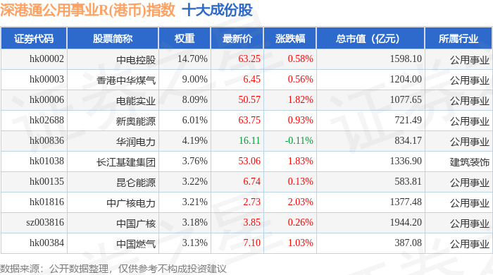 深港通公用事业R(港币)(483032)指数十大成份股详情如下: