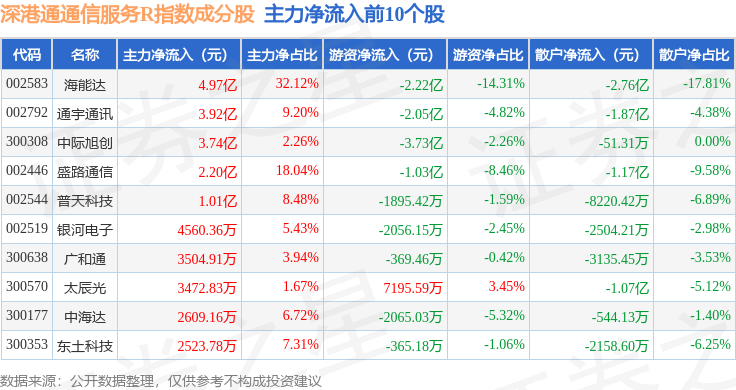 资金流向方面,深港通通信服务R(483033)指数成份股当日主力资金净流出合计20.72亿元,游资资金净流入合计7.71亿元,散户资金净流入合计13.01亿元。成份股资金流向详情见下表: