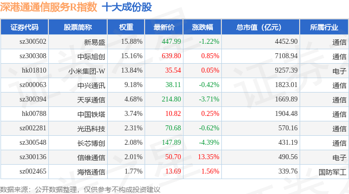 深港通通信服务R(483033)指数十大成份股详情如下: