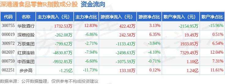 资金流向方面,深港通食品零售R(483037)指数成份股当日主力资金净流出合计2.66亿元,游资资金净流出合计3909.53万元,散户资金净流入合计3.05亿元。成份股资金流向详情见下表: