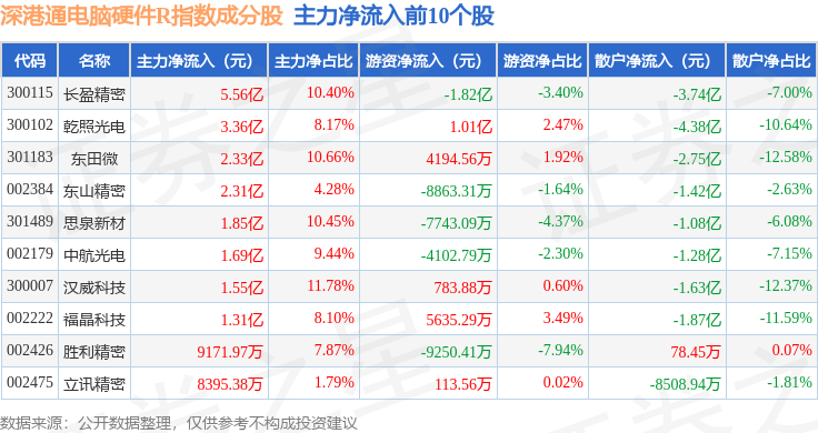 资金流向方面,深港通电脑硬件R(483043)指数成份股当日主力资金净流出合计43.04亿元,游资资金净流入合计11.13亿元,散户资金净流入合计31.91亿元。成份股资金流向详情见下表:
