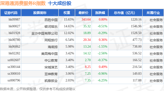 深港通消费服务R(483045)指数十大成份股详情如下: