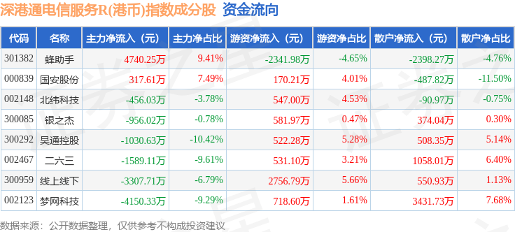 资金流向方面,深港通电信服务R(港币)(483058)指数成份股当日主力资金净流出合计6431.97万元,游资资金净流入合计3485.97万元,散户资金净流入合计2946.01万元。成份股资金流向详情见下表: