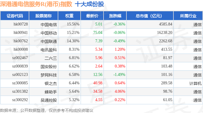 深港通电信服务R(港币)(483058)指数十大成份股详情如下: