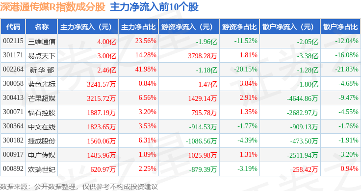 资金流向方面,深港通传媒R(483075)指数成份股当日主力资金净流入合计2.81亿元,游资资金净流出合计9523.75万元,散户资金净流出合计1.86亿元。成份股资金流向详情见下表: