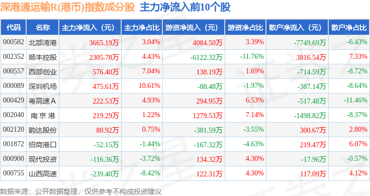 资金流向方面,深港通运输R(港币)(483078)指数成份股当日主力资金净流出合计2.81亿元,游资资金净流出合计676.81万元,散户资金净流入合计2.87亿元。成份股资金流向详情见下表: