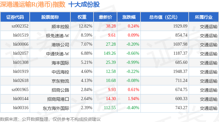 深港通运输R(港币)(483078)指数十大成份股详情如下: