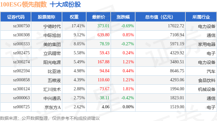 100ESG领先(970030)指数十大成份股详情如下: