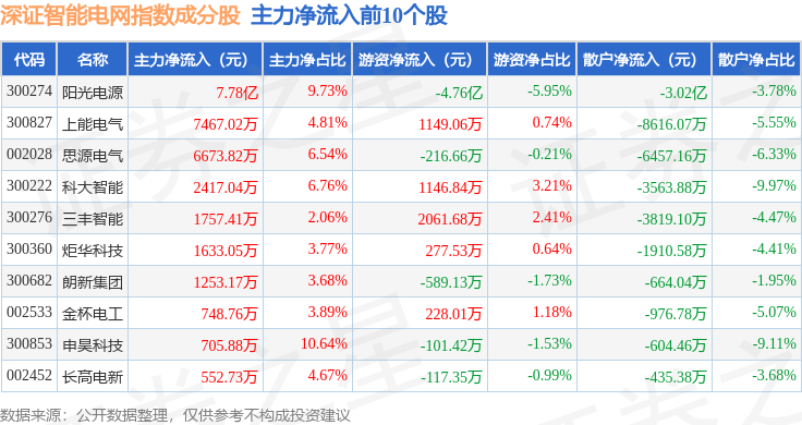 资金流向方面,深证智能电网(970054)指数成份股当日主力资金净流出合计5.56亿元,游资资金净流出合计1.49亿元,散户资金净流入合计7.05亿元。成份股资金流向详情见下表: