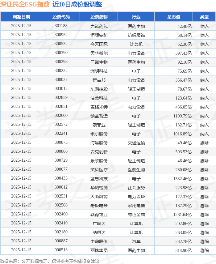 近10日内深证民企ESG(970056)指数成份股做了调整,新纳入了13只股票,剔除了13只股票。