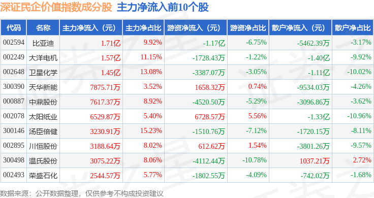 资金流向方面,深证民企价值(970072)指数成份股当日主力资金净流出合计1.91亿元,游资资金净流出合计9669.8万元,散户资金净流入合计2.88亿元。成份股资金流向详情见下表: