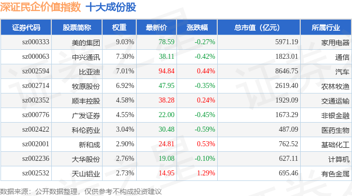 证券之星消息,12月25日,深证民企价值(970072)指数报收于3512.94点,涨0.26%,成交300.51亿元,换手率1.15%。当日该指数成份股中,上涨的有27家,盈峰环境以4.73%的涨幅领涨,下跌的有19家,永兴材料以2.83%的跌幅领跌。
