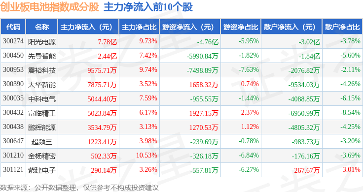 资金流向方面,创业板电池(970081)指数成份股当日主力资金净流入合计1152.31万元,游资资金净流出合计6.33亿元,散户资金净流入合计6.22亿元。成份股资金流向详情见下表: