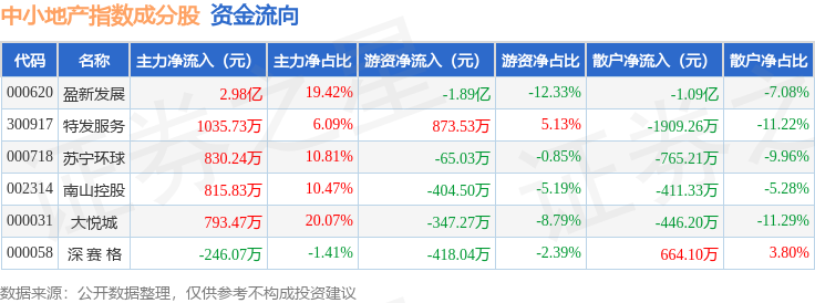 资金流向方面,中小地产(971002)指数成份股当日主力资金净流入合计3.3亿元,游资资金净流出合计1.93亿元,散户资金净流出合计1.37亿元。成份股资金流向详情见下表: