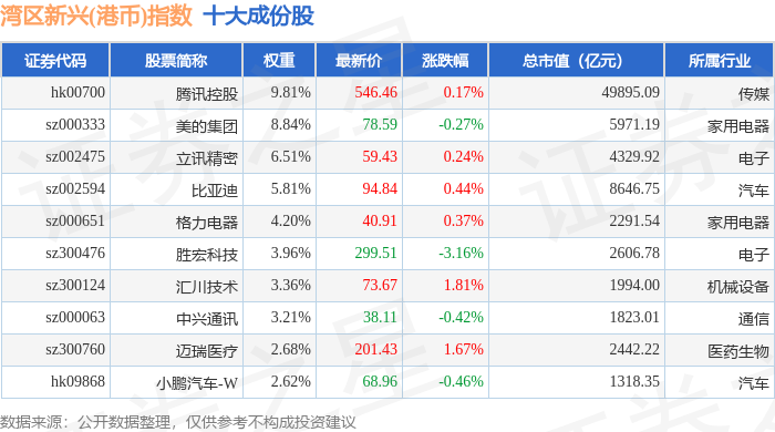 湾区新兴(港币)(980008)指数十大成份股详情如下: