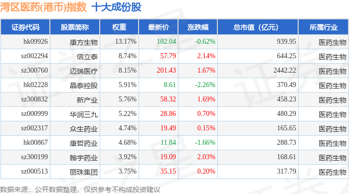 湾区医药(港币)(980014)指数十大成份股详情如下: