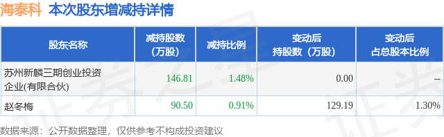 证券之星消息,12月25日海泰科发布公告《海泰科:关于特定股东减持计划时间届满暨减持完成的公告》,其股东苏州新麟三期创业投资企业(有限合伙)、赵冬梅于2025年9月25日至2025年12月24日间合计减持237.31万股,占公司目前总股本的2.3854%,变动期间该股股价下跌19.39%,截止12月24日收盘报31.39元。