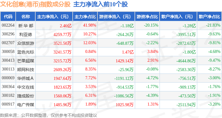 资金流向方面,文化创意(港币)(980047)指数成份股当日主力资金净流出合计9.91亿元,游资资金净流入合计1.29亿元,散户资金净流入合计8.62亿元。成份股资金流向详情见下表:
