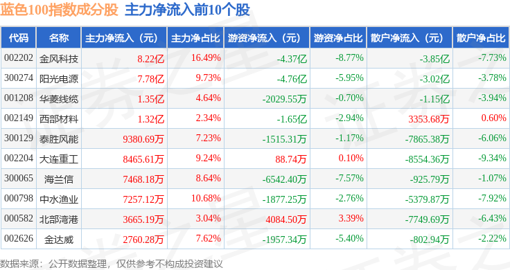 资金流向方面,蓝色100(980068)指数成份股当日主力资金净流入合计11.3亿元,游资资金净流出合计11.27亿元,散户资金净流出合计297.01万元。成份股资金流向详情见下表: