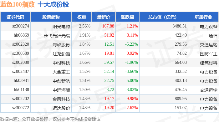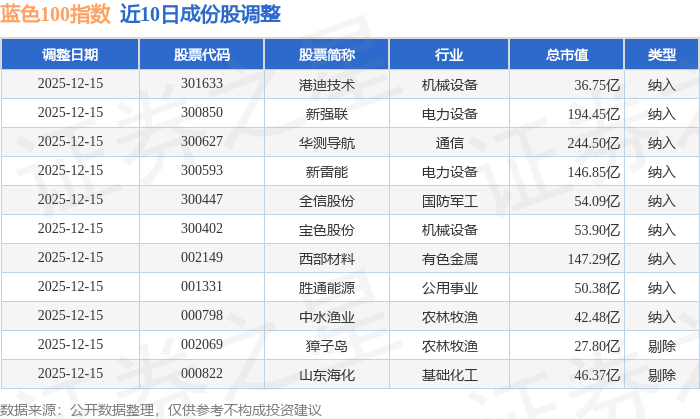 近10日内蓝色100(980068)指数成份股做了调整,新纳入了9只股票,剔除了2只股票。