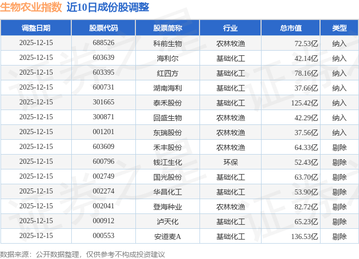 生物农业(980072)指数十大成份股详情如下: