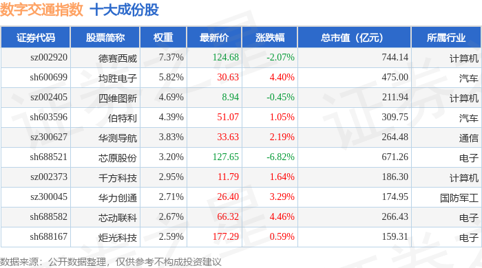 证券之星消息,12月25日,数字交通(980075)指数报收于3338.81点,涨1.8%,成交410.54亿元,换手率3.09%。当日该指数成份股中,上涨的有40家,复旦微电以16.21%的涨幅领涨,下跌的有10家,芯原股份以6.82%的跌幅领跌。