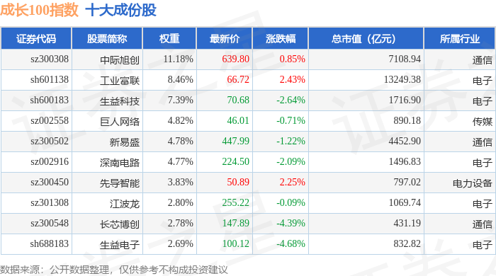 成长100(980080)指数十大成份股详情如下: