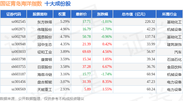 国证青岛海洋(980532)指数十大成份股详情如下: